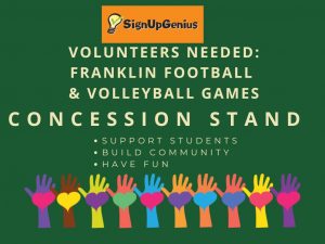 Concession sales make games fun AND support Franklin clubs and athletics. Help make our concession stand a success! We need enthusiastic volunteers to assist with stocking and selling concessions and merch as well as set-up and clean-up: