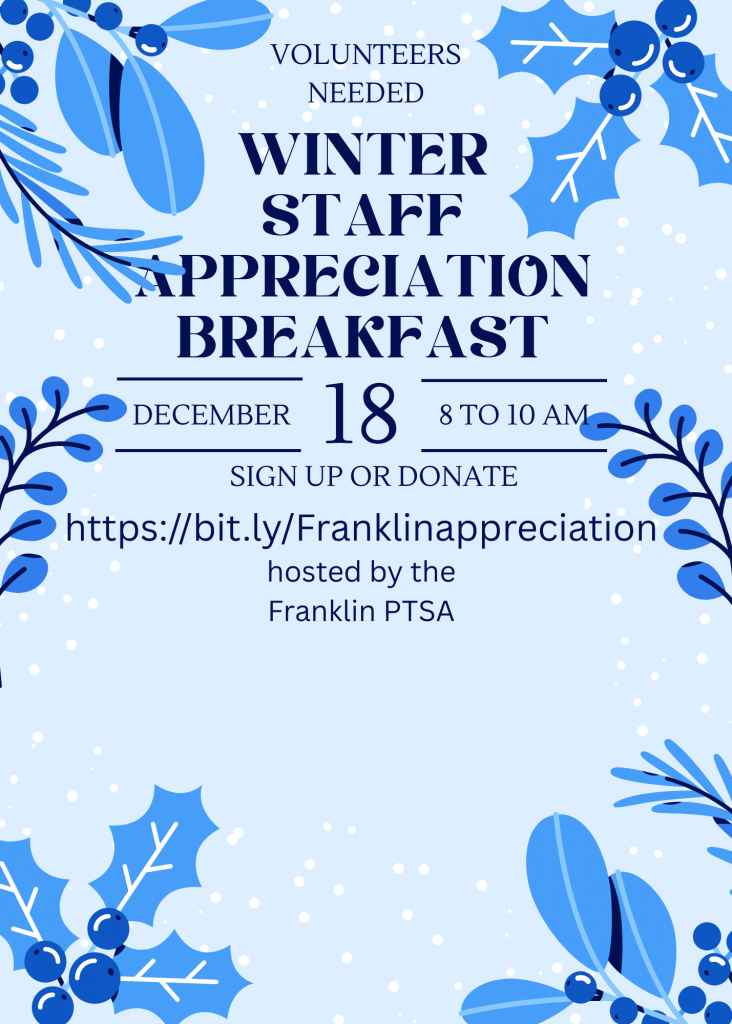 It’s Quaker Tradition for the Franklin PTSA to host the Franklin teachers and staff for a meal before winter break. It’s our way of showing gratitude for their service to our Franklin students.